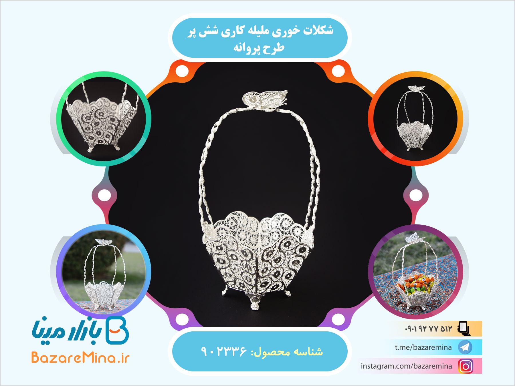 شکلات خوری ملیله کاری شش پر یکی از پر طرفدارترین محصولات در این حوزه صنایع دستی است. زیبایی و انسجام طرح های ملیله کاری در ترکیب با متریال با کیفیت این نوع ظروف را به محصولاتی جذاب تبدیل نموده است. شکلات خوری های ملیله کاری با طرح های متفاوت، هر فضایی را به شکل ویژه ای زیباتر می کنند و نظر هر بینندهای را به سمت خود جلب نمایند.